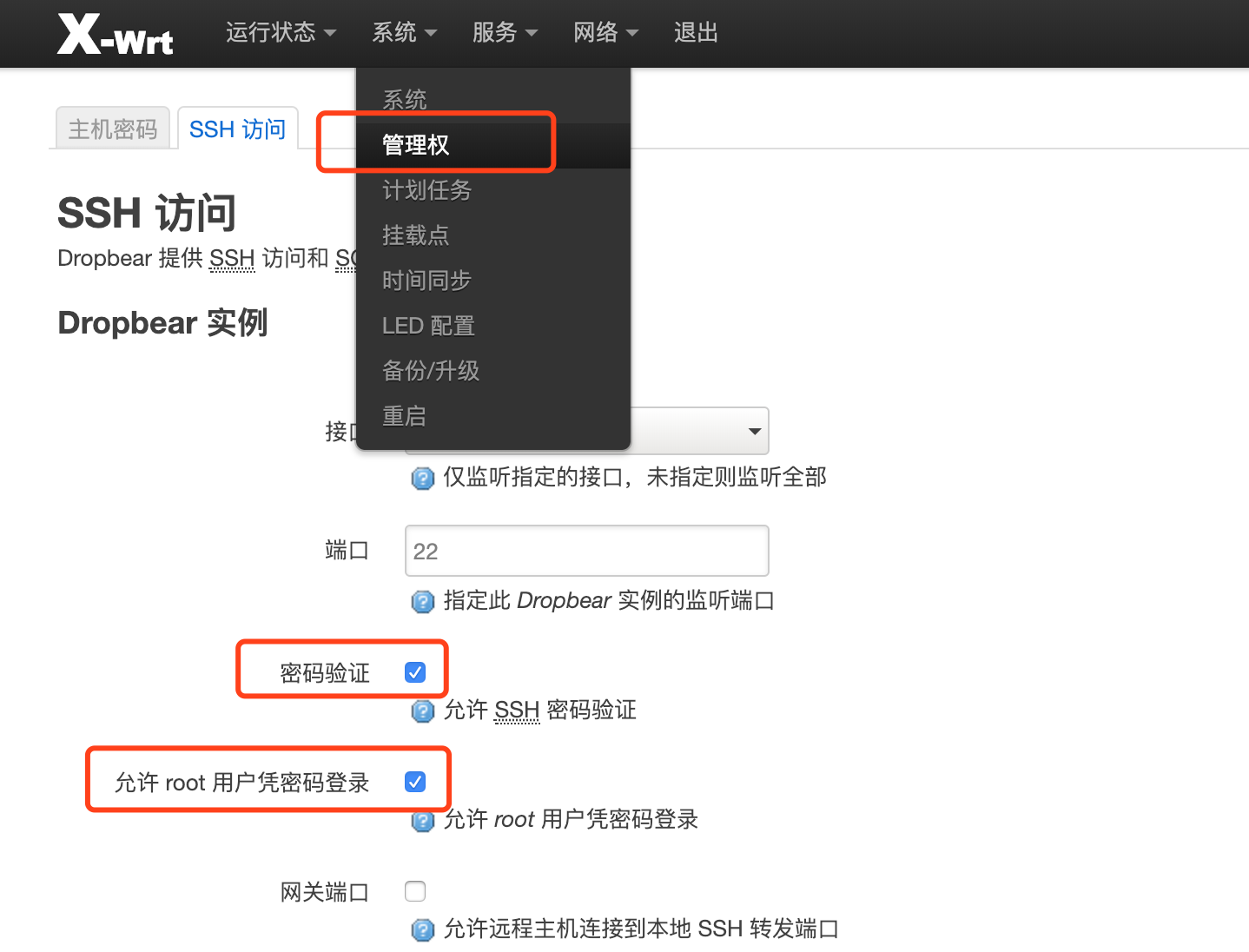 很多⼈说 X-WRT 的ssh无法登录,这其实是因为默认的ssh没有开启用户登录,大家可以进入界面,进入系统-管理权页面,进入SSH访问标签,开启密码验证和允许 root 用户凭密码登录就可以了。